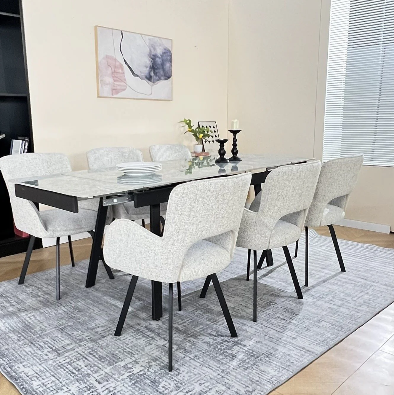 The Brutas dining chair, upholstered in a soft grey fabric that adds comfort and contemporary style. The chairs feature an ergonomic curved back, plush cushioning for support, and sleek black legs with wooden effect detailing for a modern touch.